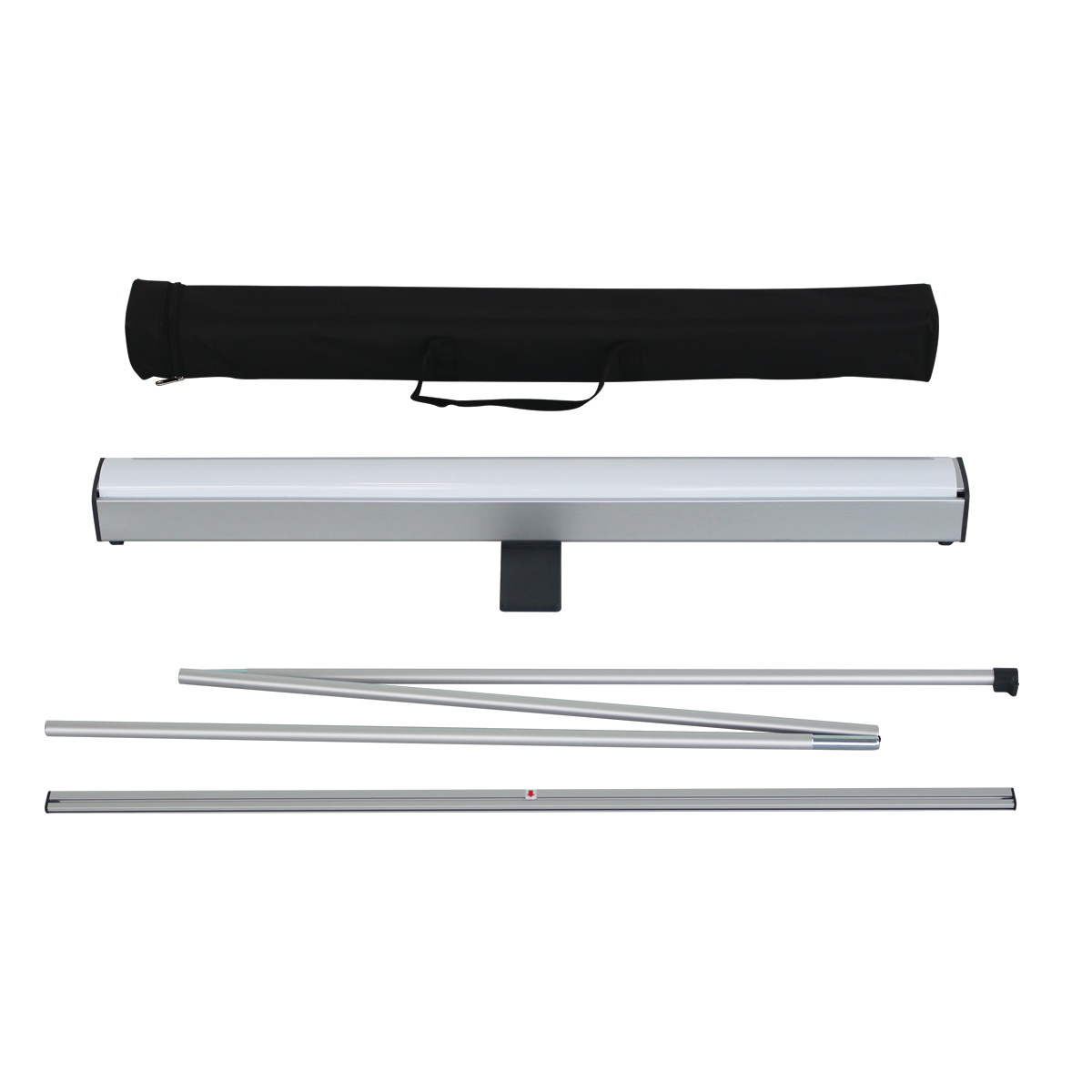 La estructura budget se suministra en una funda de transporte negra. La estructura es adecuada para materiales impresos a una cara. Se puede cambiar la impresión con esta estructura, pero no es fácil. Al cambiar las impresiones, es aconsejable utilizar cinta adhesiva nueva. El peso de la estructura incluida la funda es de 2,0-3,2 kg. Bajo la estructura hay un pie giratorio y estabilizadores laterales para que todo el conjunto se mantenga firme. En la parte superior del mástil hay una abertura para un foco halógeno.