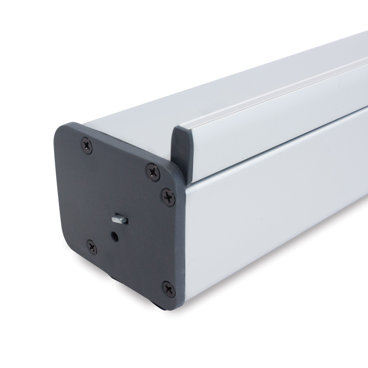 Las estructuras roll up budget de Roll-up.com tienen un precio muy competitivo. La calidad de este sistema tan compacto es buena. Esta estructura sólo está disponible en un ancho de 85, 100 cm para la impresión. La altura de la impresión es de 200 cm (la altura total de la impresión incluyendo la estructura es de 210 cm). La estructura está fabricada en aluminio de color gris plateado. A ambos lados se ha montado una tapa de plástico gris oscuro. La estructura se suministra con una buena cinta adhesiva 3M, a la que se pega la impresión. En la parte superior la impresión se fija mediante un perfil de sujeción de aluminio. El perfil de sujeción puede engancharse fácilmente detrás del mástil para mantener la impresión a la altura correcta.