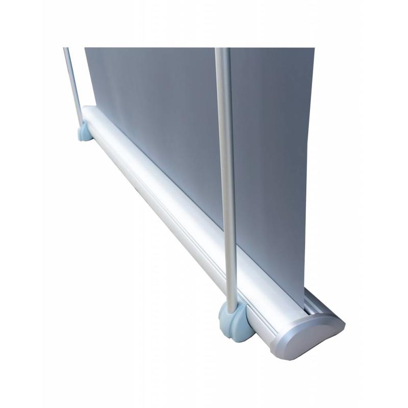 El banner roll up 120 se monta en un minuto. El producto es muy ligero, resistente, se suministra en una resistente bolsa de nylon negra con la que es muy fácil de transportar. El Roll up deluxe está pensado para promocionar su producto o empresa de una forma lujosa. Proporciona al conjunto una apariencia algo más bonita. El producto puede ser utilizado repetidamente para diferentes fines. Este roll up se entrega con gráfica y estructura de aluminio y es especialmente apto para tiendas, salones de muestra y escaparates. La anchura de la estructura de aluminio proporciona estabilidad extra al banner roll up.